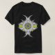 A tatuagem em emblema afiado de prata com padrão margarida no meio - combinada com o verde limão - parece excelente em camisa escura ou clara