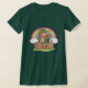 Um giro bonito de um duende sentado num tronco de madeira e tocando no banjo com um arco-íris e nuvens ao fundo. Design para Rua, dia de Patrick!