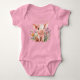 Camisa de bebê de uma peça adorável para um novo bebê menina, ou criança de qualquer idade. Um porquinho feliz senta-se entre lindas flores silvestres neste design. Adicione o nome da criança na parte superior em fonte impressa sombreada. Mostrado em uma camisa rosa, com mais cores disponíveis. Se escolher uma cor, selecione o forro para obter os melhores resultados de design. O design é facilmente transferido para qualquer outro tamanho e estilo de camisa.