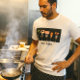 Reúna seu restaurante com esta camisa de uniforme de chef. Personalize o texto com suas informações de contato e suas especialidades de casa. Utilize a imagem apresentada ou carregue o logótipo. Esta camisa foi desenhada a partir de fotografias de grupos de comidas em garfos de janto de Oneida.