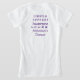 A consciência da doença de Alzheimer usa uma fita roxa para sua consciência de causa. A arte da camisa apresenta uma pintura de anjo de fita de reconhecimento roxo. A mensagem da camiseta do anjo de conscientização anota "Acredite na doença de Alzheimer CURE". Na parte de trás da camisa está a mensagem de causa "Eu espero e apoio a consciência para curar o mal de Alzheimer". A roupa de anjo de consciência roxo pode ser personalizada com mensagens personalizadas para fazer roupas de evento para a arrecadação de fundos, camisas de caminhada do grupo, presentes de camisetas de conscientização ou outras ocasiões de eventos de causas especiais para a mercadoria para ajudar a aumentar a conscientização da causa em público para a ajuda da sociedade em criar ajuda e causar mudanças.