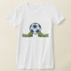 Este design é de uma bola e fita de futebol. É feito um pouco como uma faixa. A fita é verde e no meio ela sobe para uma bola de futebol. Esta bola de futebol e design de fita parecem excelentes nesta t-shirt feminina. Perfeito para si mesmo ou como presente