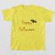 Celebre o Halloween de uma maneira fofa e divertida com uma camisa. Um morcego preto inteligente e adorável voa em torno das palavras Feliz Halloween.