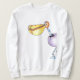 O design nesta camisa de suor é um pássaro dos desenhos animados com um bico incomum, uma cabeça alaranjada e as listras azuis e brancas nele são pescoço. Está quebrando livre de seu escudo de ovo roxo. Derwint coloriu a ilustração do lápis. Clique o botão da personalização para adicionar o texto e personalizá-lo.