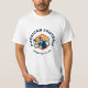 Esta camiseta dinâmica apresenta um design de logotipo ousado para um clube de futebol americano. O logótipo inclui uma forma de escudo com a menção "AMERICAN FOOTBALL" no topo, uma ilustração de um jogador em movimento de futebol, e a menção "SPORTS CLUB" no fundo. O design é acentuado com três estrelas e usa uma paleta colorida impressionante de azul escuro, branco e laranja. Perfeito para fãs de futebol americano e entusiastas desportivos.