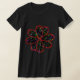 Esta camisa apresenta uma flor preta com um contorno vermelho repleto de padrões multicoloridos que fazem a flor parecer estar brilhando. A imagem foi criada por design gráfico e é bonita e delicada.