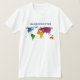 Design customizável da camisa com ilustração do mapa do mundo com continentes coloridos. Você pode personalizá-lo com seu próprio texto ou escolher um estilo e uma cor diferentes da camisa.