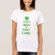 Festa de Dia de São Patrício verde engraçada para garotas não irlandesas. Não irlandês, mas quem se importa. Mantenha calma e carregar na paródia da camisa para o Dia de São Patrício. Camiseta KeepCalm personalizável com trevo de 4 folhas e letras tipográficas. Personalize a imagem e o texto com sua própria citação engraçada ou um ditado humorístico para o Dia de São Patrício. Design sua camisa de Pats de Rua fácil e rápido.