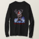 Reindeer bonitinho em uma camiseta escura decolada para a estação vestindo um chapéu de santa na cabeça na frente da camisa e uma coroa no bumbum na parte de trás, tudo pintado por Traci Van Wagoner. A frente lê Feliz Natal, Ya! e é personalizável para expressar seu próprio cartões de natal. Este personagem adorável traz certamente um sorriso à face de qualquer um que adora decorar para as férias, vestir chapéus de Papai Noel, colocar mortes, andar de trenó com uma rena, e a temporada de férias em geral. Ho, ho, ho, divirta-se e faça um inverno chorão!
