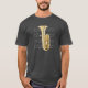 Camisa (cores escuras) com tuba e partituras. Use o botão "Personalizar" para editá-lo; escolha a cor da camisa, adicione imagens ou texto, escolha seu tamanho e estilo.