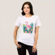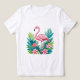Aproveite a vibração tropical de costas com este na moda flamingo cercado por flores e folhas exuberantes. Perfeito para salões de verão, viagens de praia, ou festas tropicais, este gráfico atraente combina pintas pastéis, verdes e azuis em um fundo limpo e transparente. Ideal para visto casual de verão.