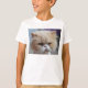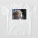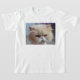 Fotos de um adorável gato persa são apresentadas na frente e atrás desta camisa.