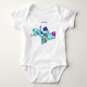 Esta imagem mostra um traje de corpo branco para bebês com uma ilustração divertida, em estilo de desenho animado, de um cão azul vestindo óculos e andando numa bicicleta minúscula. O cão tem um nariz rosa brilhante e está a pedalar brincalhão, deixando uma pequena poeira para trás. Acima do desenho, há um texto marcador que diz "Seu texto", sugerindo que este design pode ser personalizado. É uma peça engraçada e caprichosa de roupa bebê perfeita para uma pequena e divertida.