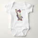 Esta imagem mostra uma roupa branca para bebês impressa com um pato de desenho animado vestindo um boné de baseball roxo e segurando um taco de madeira, atingindo uma pose confiável. O texto "seu texto" acima do pato indica que este é um design personalizável. O caráter lúdico e desportivo faz dela uma escolha divertida e única para o visto temático de bebês ou presentes personalizados.