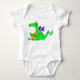 Esta foto mostra uma roupa branca para bebês com um dragão verde lúcido com asas roxas e uma expressão pateta. O design de desenho animado colorido dá um toque divertido e caprichoso ao vestuário das crianças.