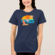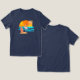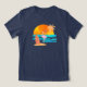 Esta ilustração tropical e divertida explode com vibrantes vibrações. Um flamingo rosa gracioso fica em uma mancha arenosa ao lado de um prato de surfe, colocado contra um nítido pano de fundo do sol com céus laranja e pinceladas do oceano azul. À distância, as palmeiras balançam suavemente, somando-se à atmosfera da praia.