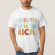 A design da camiseta apresenta a frase "Rir é Rico" escrita em uma fonte ousada e divertida no centro. Ao redor do texto estão ilustrações caprichosas de rostos risonhos, cada um com uma expressão única, acrescentando ao tema alegre e iluminado do design. O esquema de cores é vibrante, com uma mistura de tons quentes como laranja, amarelo e vermelho, melhorando a vibração alegre e positiva do design geral.