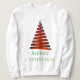 Esta camisa apresenta uma árvore de Natal vermelha moderna e uma saudação de Natal feliz. Mostrada em uma camisa preta, também está disponível em uma variedade de cores e outros estilos.