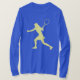 Camisa tênis de esportes de manga azul longa para senhoras. Desenho de silhueta amarela de jogadora fêmea com raquete tocando um traço na mão. Cor de design personalizável. Adicione seu próprio texto pessoal, opcionalmente. Roupa atlético de cores personalizadas com impressão para mulheres.