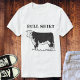 O touro preto e branco tem uma textura falsa em couro e o texto "Bull Shirt" por cima.