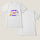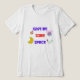 Esta camiseta apresenta um design ousado e colorido com a frase "DÊ-ME ALGUM ESPAÇO". A design inclui imagens espaciais como foguetes, planetas, capacete de astronauta e estrelas. O tema da design é lúdico e foca-se na exploração espacial e astronomia.