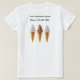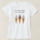 Camisas de trabalho de funcionários de empresas para um Compro de Sorvetes com gráficos de três cones e borrifagens de sorvetes, além de espaço para seu nome comercial, número de telefone ou promoção especial ou nome de evento. Impresso na frente e atrás para que o design seja visto em ambos os lados.