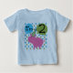 Os t-shirt cor-de-rosa do segundo aniversário do porco, bodysuits, sacolas, botões do aniversário, e caracterizando um porco que veste um chapéu do partido, uns balões e umas bolinhas azuis e verdes, e um texto que me leia "são 2".