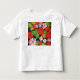 Uma t-shirt com um design de flores vermelhas e cor-de-rosa no estilo Petrykivka, colocada sobre um fundo preto. O intrincado padrão floral é caracterizado por pinceladas vibrantes e detalhadas, com folhas delicadas e botões acentuando as flores. As cores ousadas se destacam lindamente contra o tecido escuro, criando um contraste impressionante e um rico.