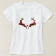 Uma t-shirt com uma ilustração de 2 cervos de Natal saltando. Os cervejeiros são feitos de xadrez vermelha e preta, com um pequeno coração no meio.