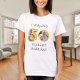 Para uma t-shirt branca/clara. Personalize e adicione sua foto. Texto: Celebrando 50 anos de casamento. O número 5 é escrito com uma fonte de estilo de balão. Fotograma de ouro falsa.