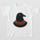 The image shows an illustration of a black crow with a white eye and no pupil, wearing a colorful necklace around its neck. The necklace is made up of red beads and red and green fall leaves, interspersed with small red crosses.