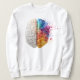 Artistic representation of the human brain, where the left hemisphere is monochromatic (white/cream) and the right hemisphere explodes in vibrant watercolor colors.