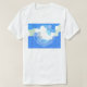 Esta camisa branca do desgaste dos homens com ela é as mostras da aparência da luz branca azuis e a pedra amarela como formas com e a luz branca que brilha jogou a representação da luz para o céu.