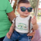 Texto verde, "Pequeno pinheiro" curvo no topo, arco-íris verde de "1rua" com dentro do arco-íris. Um trevo e um pequeno duende segurando cerveja nos lados do arco-íris. E, "Dia de São Patrício!" no fundo com grande tamanho de texto. E em um tamanho de texto menor abaixo, isto é, "Embora ele esteja bebendo o chocalho já Maíri."