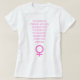 Em um texto cor-de-rosa, a camiseta diz: "A Terra é Mulher, e ela rima com os ecos das mulheres lutando pela Justiça!". O texto é seguido pelo símbolo feminino, também em rosa. O texto é digitado para ser projetado em forma de exclamação.