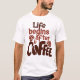 Esta t-shirt branca apresenta o texto "A vida começa depois do COFFEE" numa cor castanho quente, com a palavra "COFFEE" a ser exibida de forma destacada numa fonte grande e estilizada que incorpora formas de café. São colocadas pequenas ilustrações do grão de café em torno do texto.