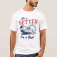 Esta t-shirt branca apresenta o texto "Life is BETTER On a Boat" em letras azuis e vermelhas sobre um gráfico estilizado de um barco na água com montanhas e um sol de ascensão no fundo. A design promove o prazer do barco e do estilo de vida ao ar livre.