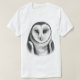Uma t-shirt com um lápis desenhando uma coruja de celeiro.