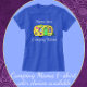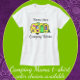 Um doce trailer viagem amarelo-claro, decorado com flores e corações, tem duas janelas vestidas com cortinas. Uma janela tem uma planta de tulipas sentada no peneiro da janela. Esta camisa colorida inclui duas modelos para texto. O texto padrão abaixo da câmera é: Camping Mama. Este texto é facilmente alterado, se assim o desejar. Acima da câmera, você deve alterar o texto padrão para um nome, iniciais ou outro texto de sua escolha. Você também pode mudar a cor do texto para complementar a escolha da cor da camisa.