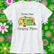 Um doce trailer viagem amarelo-claro, decorado com flores e corações, tem duas janelas vestidas com cortinas. Uma janela tem uma planta de tulipas sentada no peneiro da janela. Esta camisa colorida inclui duas modelos para texto. O texto padrão abaixo da câmera é: Camping Mama. Este texto é facilmente alterado, se assim o desejar. Acima da câmera, você deve alterar o texto padrão para um nome, iniciais ou outro texto de sua escolha.