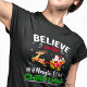 Espalhe a alegria das festas com esta camiseta festiva "Acredite na Mágica do Natal", com Papais noeis na manga, uma rena voadora e flocos de neve cintilantes. Perfeito para festas de Natal, reuniões familiares, eventos de férias ou noites confortáveis pelo fogo. Faz um presente divertido para qualquer um que ama a magia da estação.