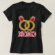 Elevate your style with this women's t-shirt in sleek black, showcasing intertwined braided wedding rings with red gem hearts and flirty pink knitted XOXO hugs for a trendy crochet vibe. Perfect for bridal parties, bachelorette weekends, anniversaries, date nights, or casual wear that celebrates love with a handmade touch. The vibrant pinks, reds, and golds pop against the black background for effortless chic appeal.