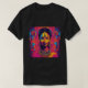 A design da camiseta apresenta uma figura deusa adornada com joias intricadas e uma peça radiante. Seu rosto é pintado em cores vibrantes de neon, misturando tons de amarelo, rosa e azul. O fundo abstrato oscila com matizes ousados, criando uma atmosfera energética e mística, evocando poder, elegância e divindade.