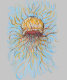 Uma água-viva surpreendente é representada com uma geleia fluida e colorida. As intrincadas linhas em azuis e laranjas vibrantes dão uma sensação de movimento e graça. Essa imagem captura a delicada beleza da vida marinha com um talento artístico.