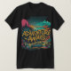 Um design vibrante e colorido com a frase "Aguardam Aventura" em um gradiente do arco-íris, cercado por nuvens e montanhas giratórias, perfeito para quem busca entusiasmo e exploração.