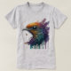 A t-shirt tem uma cabeça de pássaro vibrante e estilizada. O trabalho de arte é caracterizado por uma paleta de cores ousada, quase surreal, com tons de laranja, roxo, azul e verde se misturando perfeitamente. As penas das aves são representadas com detalhes intrincados, parecendo quase iridescentes. O efeito geral é impressionante e atraente, com uma sugestão de fantasia e de capricho. A design pode apelar para aqueles que apreciam a arte abstrato, a natureza, ou estética vibrante e colorida.