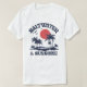 Esta camiseta branca apresenta uma cena de praia com palmeiras e um sol vermelho sobre o oceano. As palavras "SALTWATER" e "& SUNSHINE" são impressas em uma fonte azul marinho e em negrito acima e abaixo da cena. Silhuetas de aves também são visíveis no céu. Esta design evoca um sentimento de relaxamento e um amor pelo oceano.