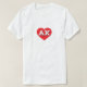 Esta camisa tem um coração vermelho vibrante contendo as letras maiúsculas brancas em negrito AK, a abreviação oficial do Alasca, a última fronteira.