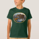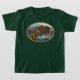 Um alce e seu bezerro bonitinho com um lago e montanhas à distância. A leitura de texto "Alaska" em uma fonte coberta por neve também é exibida.