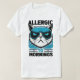 Uma ilustração humorística de um gato rabugento vestindo uma máscara de sono azul e óculos de sol. O gato tem um rosto branco e olhos azuis, e sua expressão é de puro incômodo. O texto "ALERGIC TO MORNINGS" é escrito por cima e por baixo do gato, com uma linha decorativa que separa as palavras. A design é simples e atraente, com uma mensagem clara que apelará aos amantes de gatos e a qualquer pessoa que luta para sair da cama de manhã.